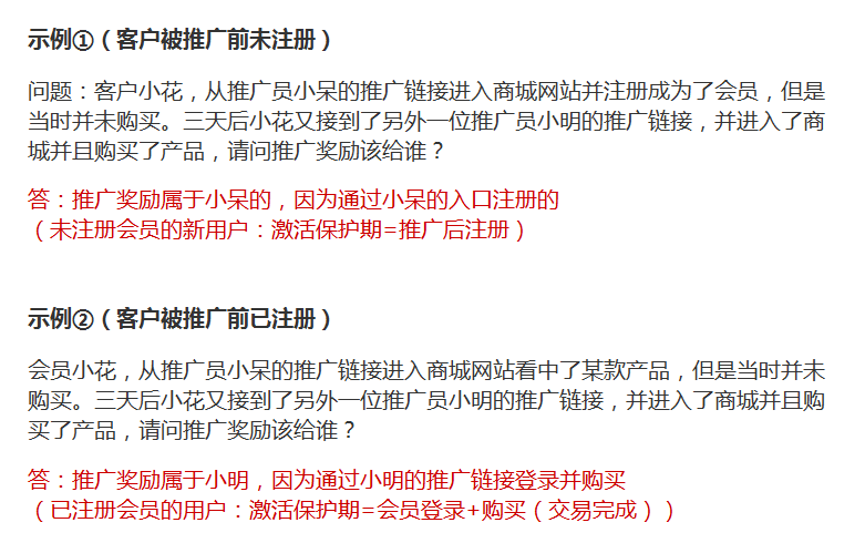 客戶保護(hù)期的定義為“當(dāng)用戶首次進(jìn)入某推廣員的鏈接/二維碼并購買產(chǎn)品或注冊成為會(huì)員時(shí),該用戶在指定的保護(hù)期內(nèi)則綁定為該推廣員的客戶,之后無論用戶去到哪里下單(其他推廣員的鏈接或者總店),推廣員都可以得到獎(jiǎng)勵(lì);當(dāng)保護(hù)期到期后,用戶再點(diǎn)擊鏈接,則保護(hù)期自動(dòng)續(xù)期,如保護(hù)期為15天,則續(xù)期15天”。