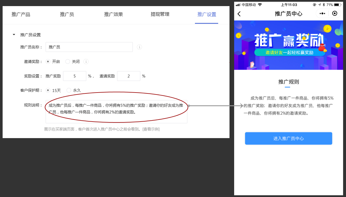 a-4.規(guī)則說明:可自定義推廣員的推廣規(guī)則,規(guī)則將會(huì)展示在買家端頁面,當(dāng)客戶首次進(jìn)入推廣員中心之前會(huì)看到。