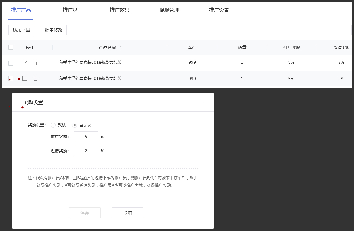 ③點(diǎn)擊“推廣產(chǎn)品”標(biāo)簽項(xiàng),您可自行添加參與推廣的活動(dòng)產(chǎn)品。添加推廣產(chǎn)品后,您可自定義其推廣獎(jiǎng)勵(lì)和邀請(qǐng)獎(jiǎng)勵(lì)的百分比,也可以選擇默認(rèn)獎(jiǎng)勵(lì)。參與推廣的活動(dòng)產(chǎn)品的產(chǎn)品詳情頁會(huì)顯示“賺”。