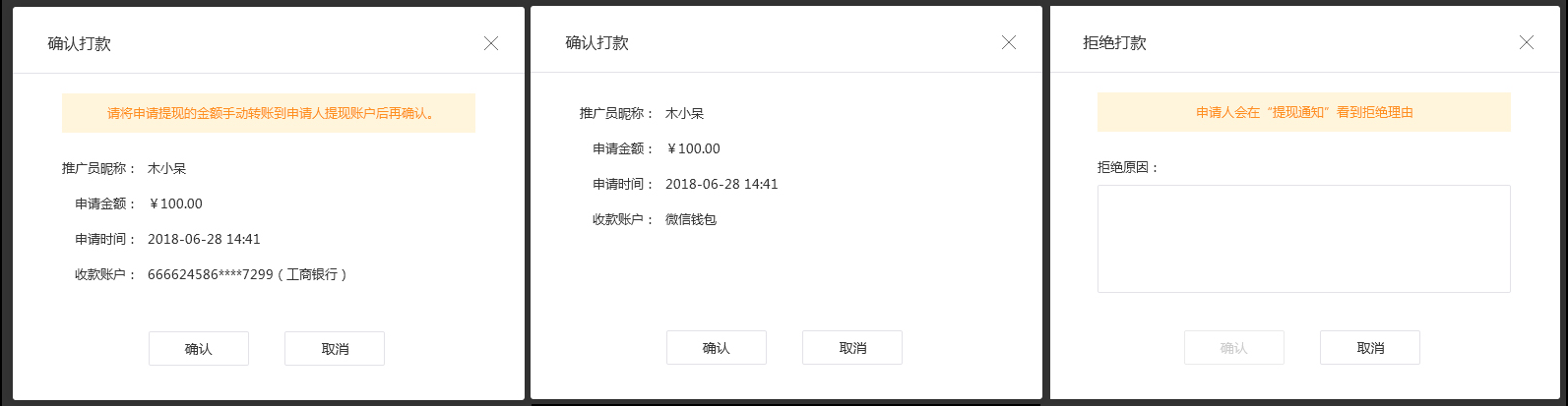當(dāng)選擇結(jié)算方式為“商家手動(dòng)結(jié)算”時(shí),商家需要在推廣員發(fā)起獎(jiǎng)勵(lì)提現(xiàn)時(shí),線下自行打款給推廣員,然后再在系統(tǒng)進(jìn)行線上確認(rèn)【打款】操作。