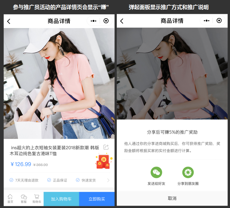 b.在參與推廣活動(dòng)的產(chǎn)品的產(chǎn)品詳情頁點(diǎn)擊“賺”的標(biāo)識(shí),將產(chǎn)品分享給好友或朋友圈。